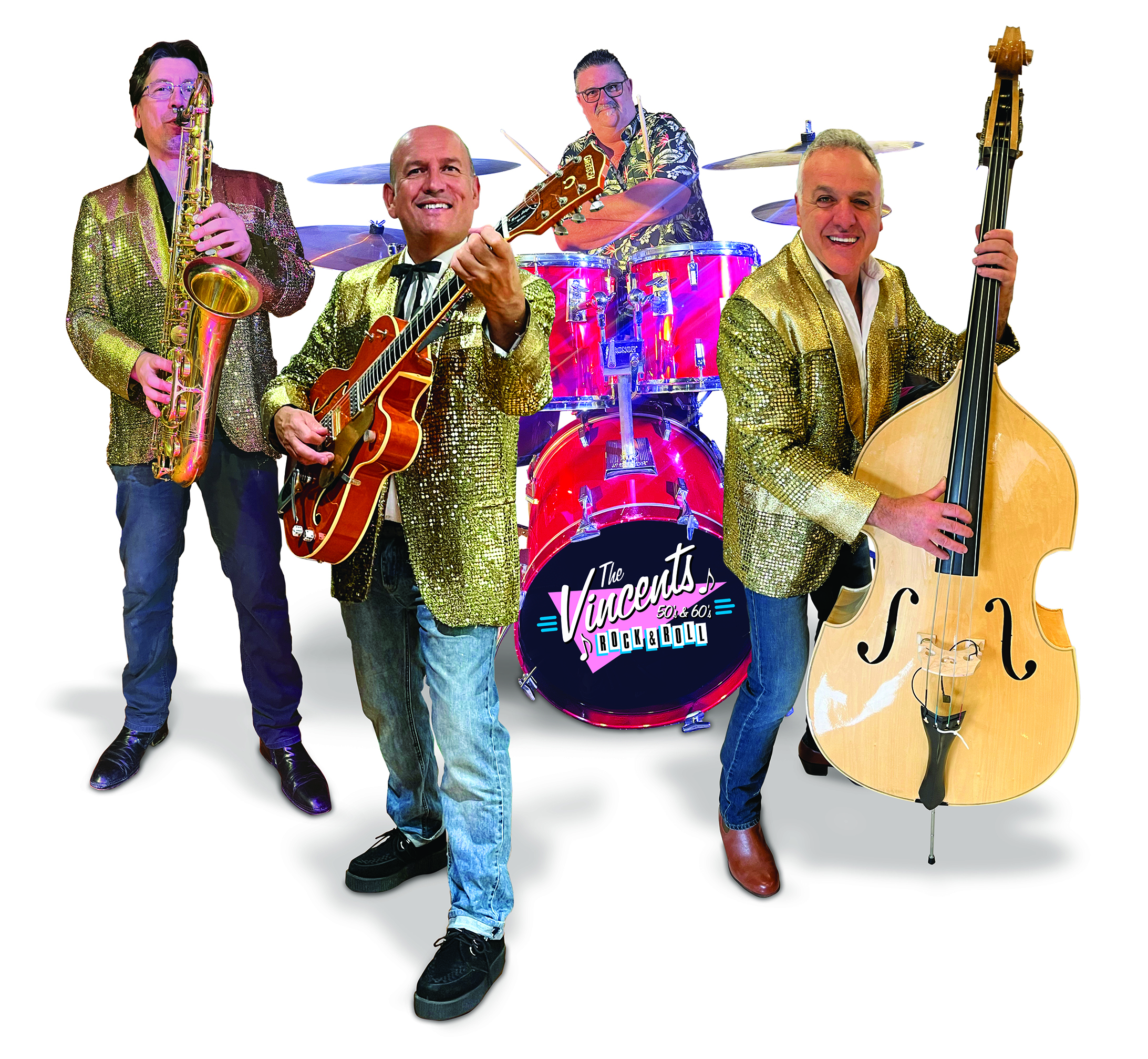 The VINCENTS can be heard playing a touch of commercial to authentic 50’s & 60’s rock & roll music with a splendour of harmonies and the original guitar and sax sounds of the era. Many band members have come and gone over the years, but we still pack the dance floor with great songs and an occasional guest artist. The four-piece band features two vocals, guitar, saxophone, bass and drums. Other band members are available to suit a client event.